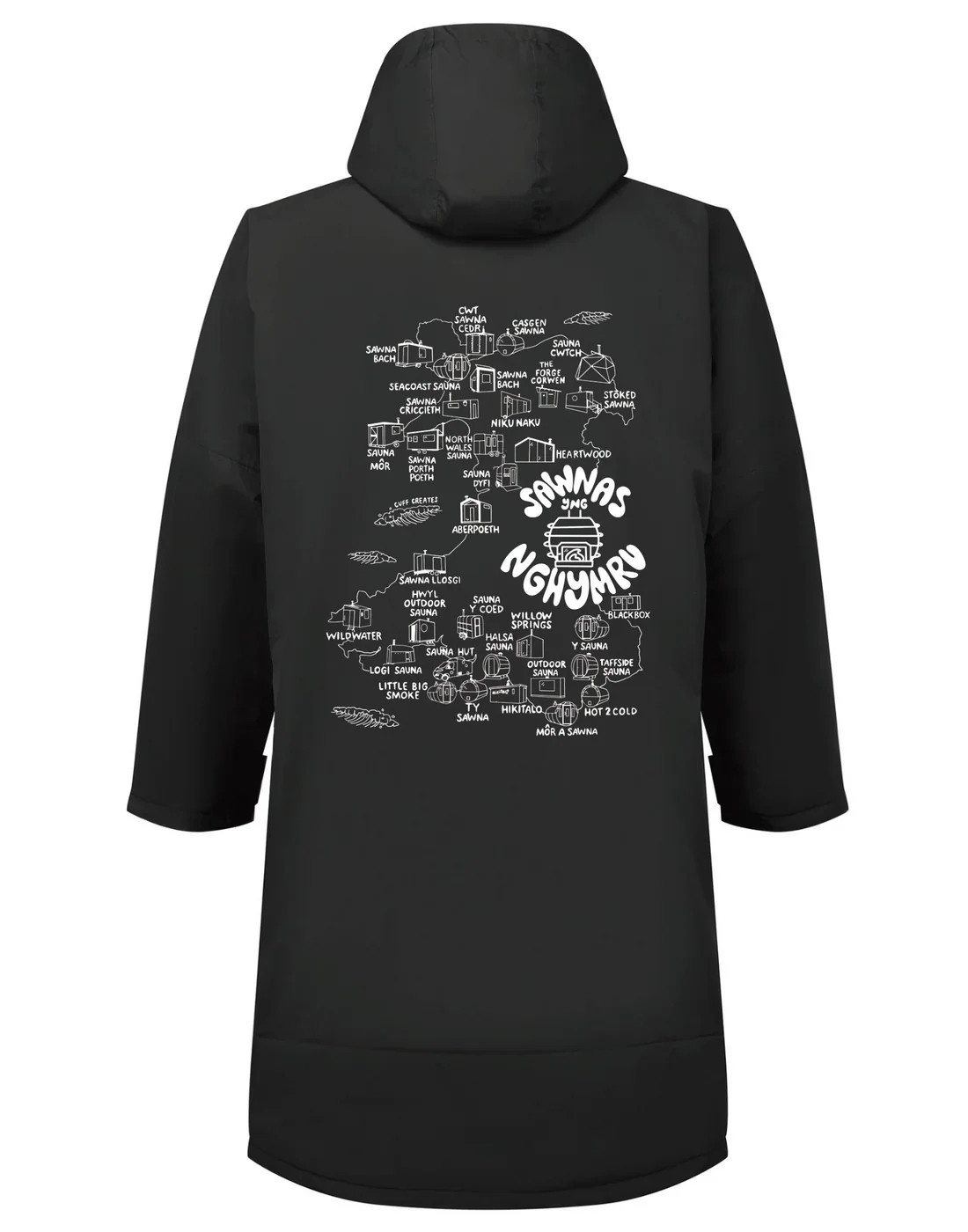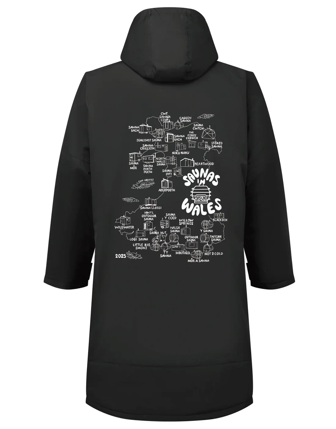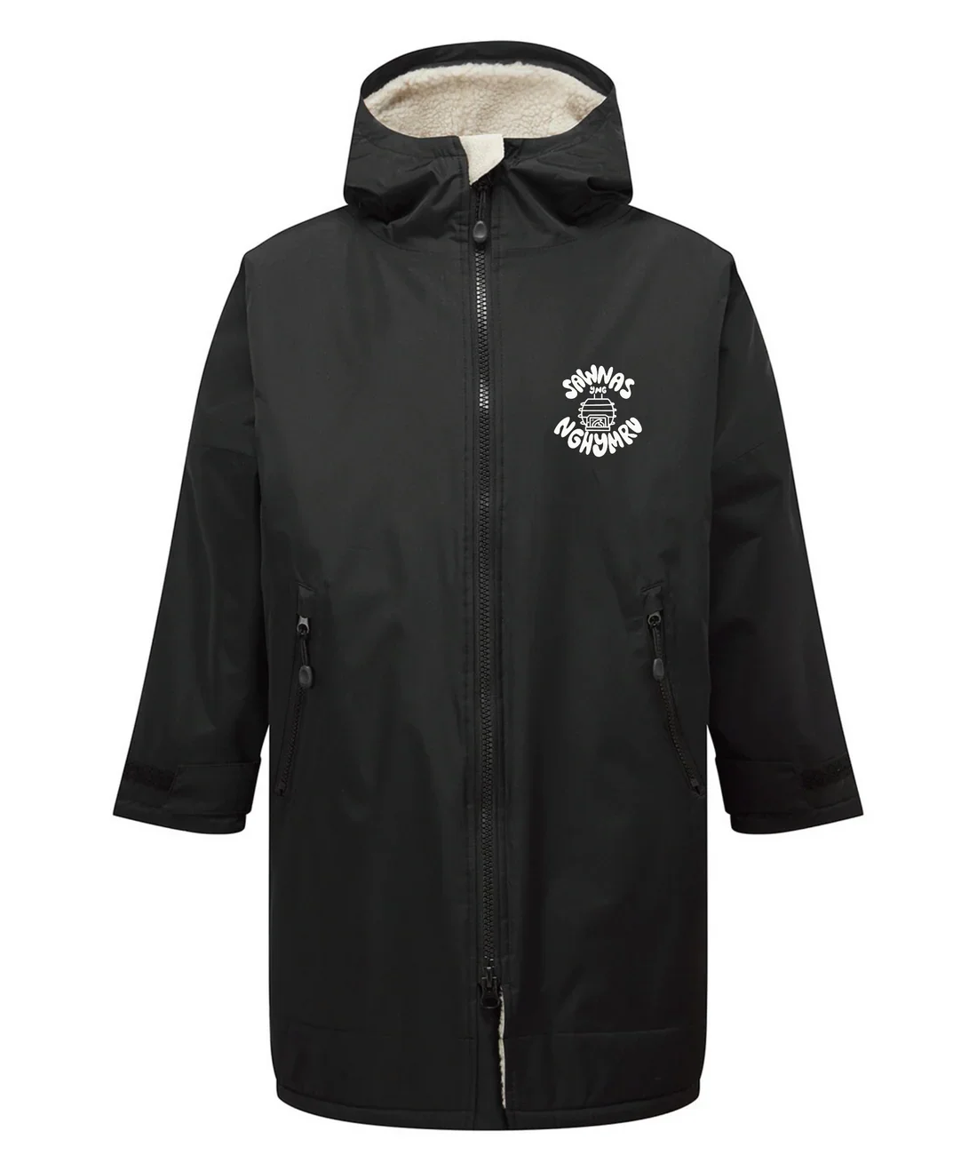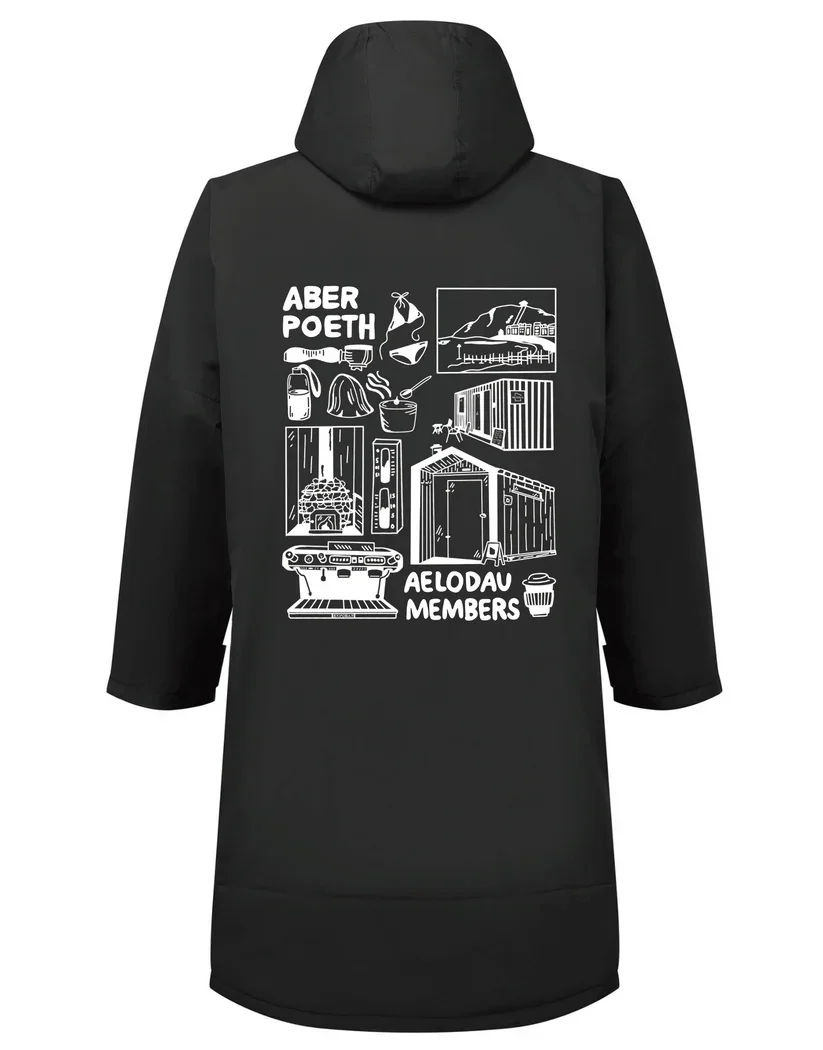 Aberpoeth's latest outerwear is essential in everyone’s wardrobe! The Sawna’s yng Nghymru. All-seasons waterproof changing robe boasts a waterproof exterior with hood to keep you dry, as well as adjustable straps to the wrists and chin guard to help lock in heat on windy days.